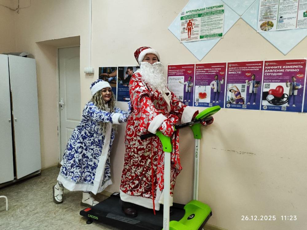Дед Мороз и Снегурочка решили подать личный пример и показать важность заботливого отношения к своему здоровью. Они приглашают всех желающих присоединиться к профилактике и пройти бесплатную диспансеризацию, подчеркивая необходимость регулярного медицинского осмотра.